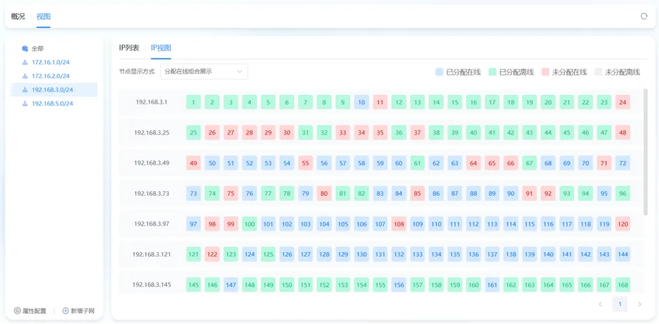 同时,提供网格化 IP 视图,可以清晰的呈现 IP 资源的分布和状态,管理员可以一目了然地看到 IP 的在线、离线、分配、未分配等情况。管理员只需轻轻一瞥,就能对整个网络的 IP 资源使用状况了如指掌,极大地提高了管理效率,方便了资源的调配和规划。