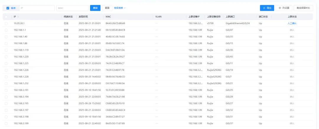 当网络出现故障时,快速定位问题源头是解决问题的关键。乐维网管的终端定位能力通过深入分析接入端口模式(Access/Trunk)、MAC 地址表、LLDP 邻居信息等,能够自动判定终端类型,并快速定位到上联设备 IP、上联设备名称、上联端口、端口状态、发现时间、VLAN、MAC 等详细信息,大幅缩短网络故障(如终端断网、传输异常)的排查周期,为故障解决提供精准依据,是网络故障排查的关键支撑能力。
