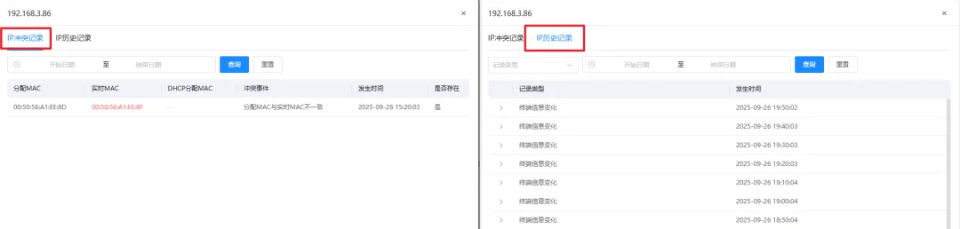 IP 冲突是网络中常见的问题,它会导致网络通信异常,甚至引发网络瘫痪。乐维网管的 IP 审计能够自动识别 IP 冲突,包括实时 MAC 与分配 MAC 不一致、实时 MAC 与 DHCP 分配 MAC 不一致、多 MAC 的冲突情况等。管理员可以根据这些信息迅速采取措施解决冲突,保障网络的正常运行。此外,IP审计还提供了IP冲突记录与IP历史记录,为网络安全审计提供有力支持。