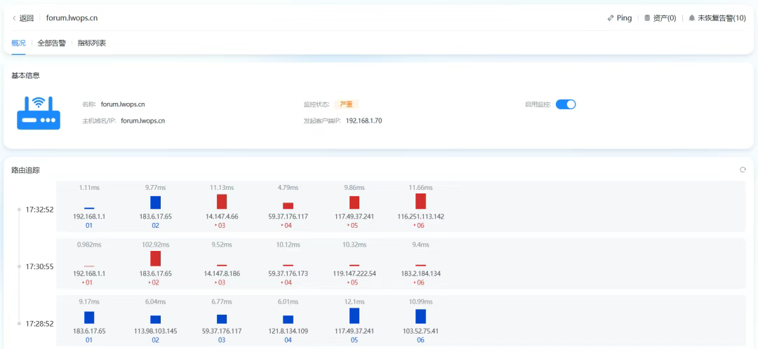 结合监控状态(当前显示“严重”),可以把路由追踪的异常节点,直接和业务系统的不可用状态关联起来,快速判断“是网络节点故障导致了业务中断”,避免运维人员在业务层和网络层之间反复排查。