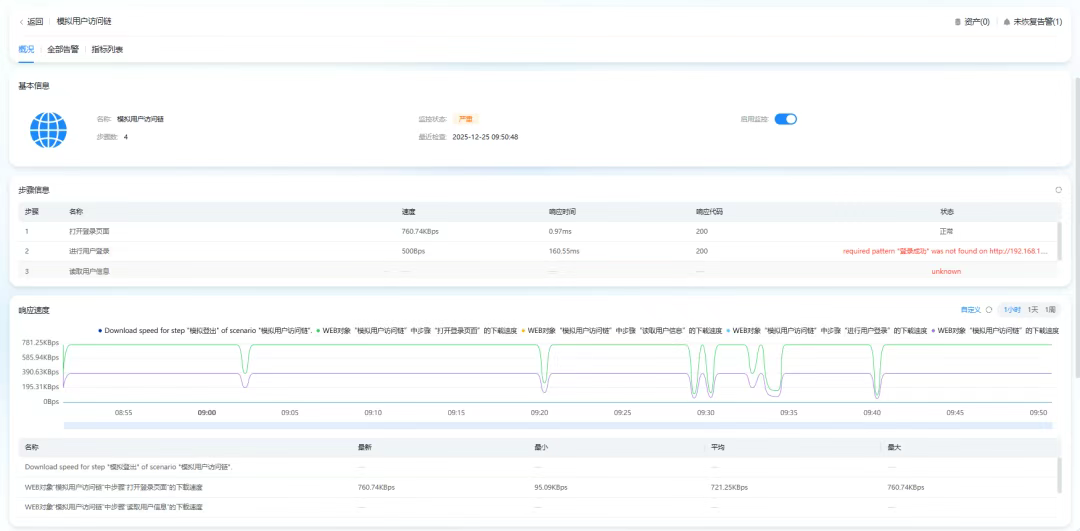 Web服务作为企业数字化交互的核心入口,其稳定性与响应速度直接影响用户体验。乐维监控针对Web场景提供精细化探测能力,不仅可实时采集 URL 地址的响应时间、响应代码、服务状态、响应速度等核心指标,更实现了多步骤监控的深度拓展——模拟用户登录、用户查询等业务操作,还原真实业务场景下的端到端体验监测,精准满足企业对”业务可用性+用户体验+故障精准定位“的核心运维需求。