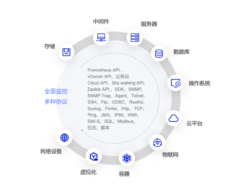 Perseus采集平台已兼容数十种协议,并支持基因技术自动适配,可满足信创和非信创软硬件监控采集,覆盖500+厂商,8000+设备型号,包含:传统IT基础设施、公有云、私有云、容器、物联网等。