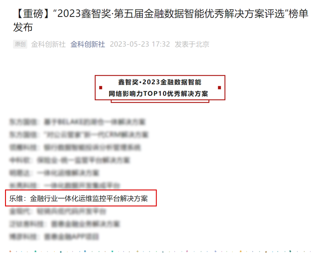 日前,“2023鑫智奖·第五届金融数据智能优秀解决方案评选”结果正式出炉,乐维参评的【金融行业一体化运维监控平台解决方案】荣获网络影响力TOP10优秀解决方案。
