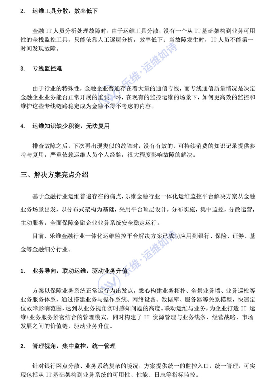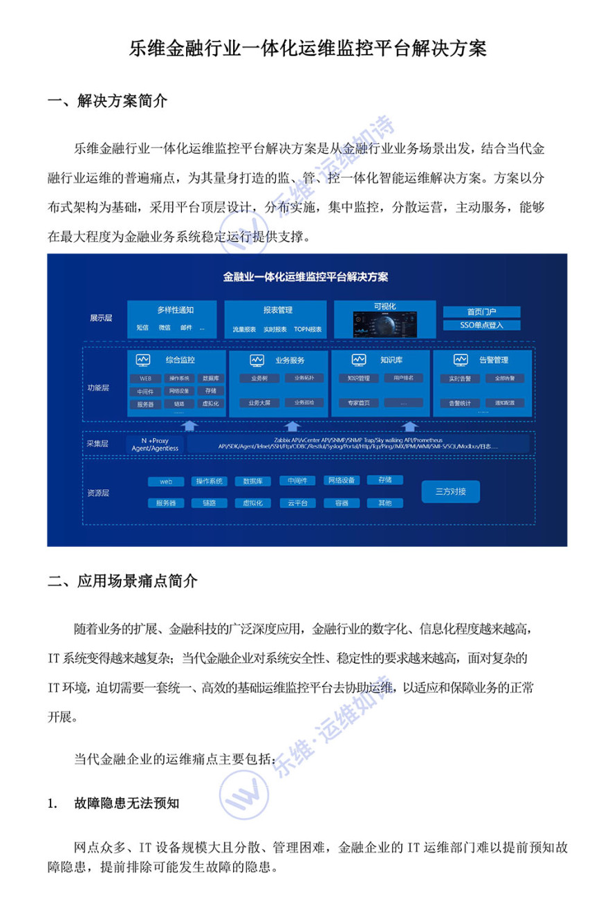 乐维金融行业一体化运维监控平台解决方案是面向金融行业业务场景,结合当代金融行业运维的普遍痛点,量身打造的监、管、控一体化智能运维解决方案。方案以分布式架构为基础,采用平台顶层设计,分布实施,集中监控,分散运营,主动服务,能够在最大程度为金融业务系统稳定运行提供支撑。