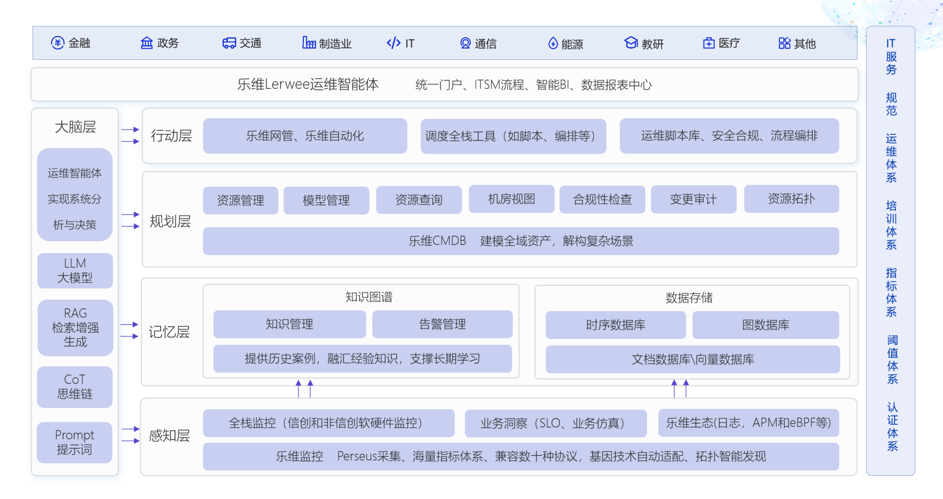 Lerwee AI,以乐维监控为入口,深度融合CMDB、网管、业务洞察等模块,依托大模型分析能力,串联ITSM、自动化、事件平台,构建感知、记忆、规划、行动、大脑等五大层级架构,形成资产智发现、全栈监控、业务洞察、智能分析四大特点,具备自主感知、推理、分析与决策能力。