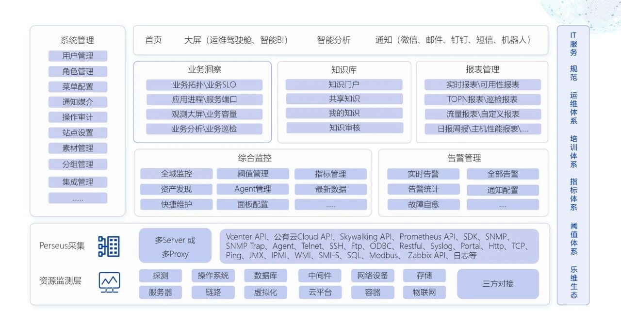 乐维智能运维监控平台(简称“乐维监控”)是乐维自主研发的一站式运维监控管理平台。作为Lerwee运维智能体的感知层,乐维监控支持全栈IT资源监控( 500+厂商,8000+设备型号),贯穿IaaS、PaaS、SaaS、IoT环境,覆盖操作系统、服务器、网络设备、存储、虚拟化、容器、物联网等类型,全面适配信创环境,提供实时监控、智能告警、精准诊断、业务洞察等核心能力,全方位守护您的IT基础架构与业务系统。