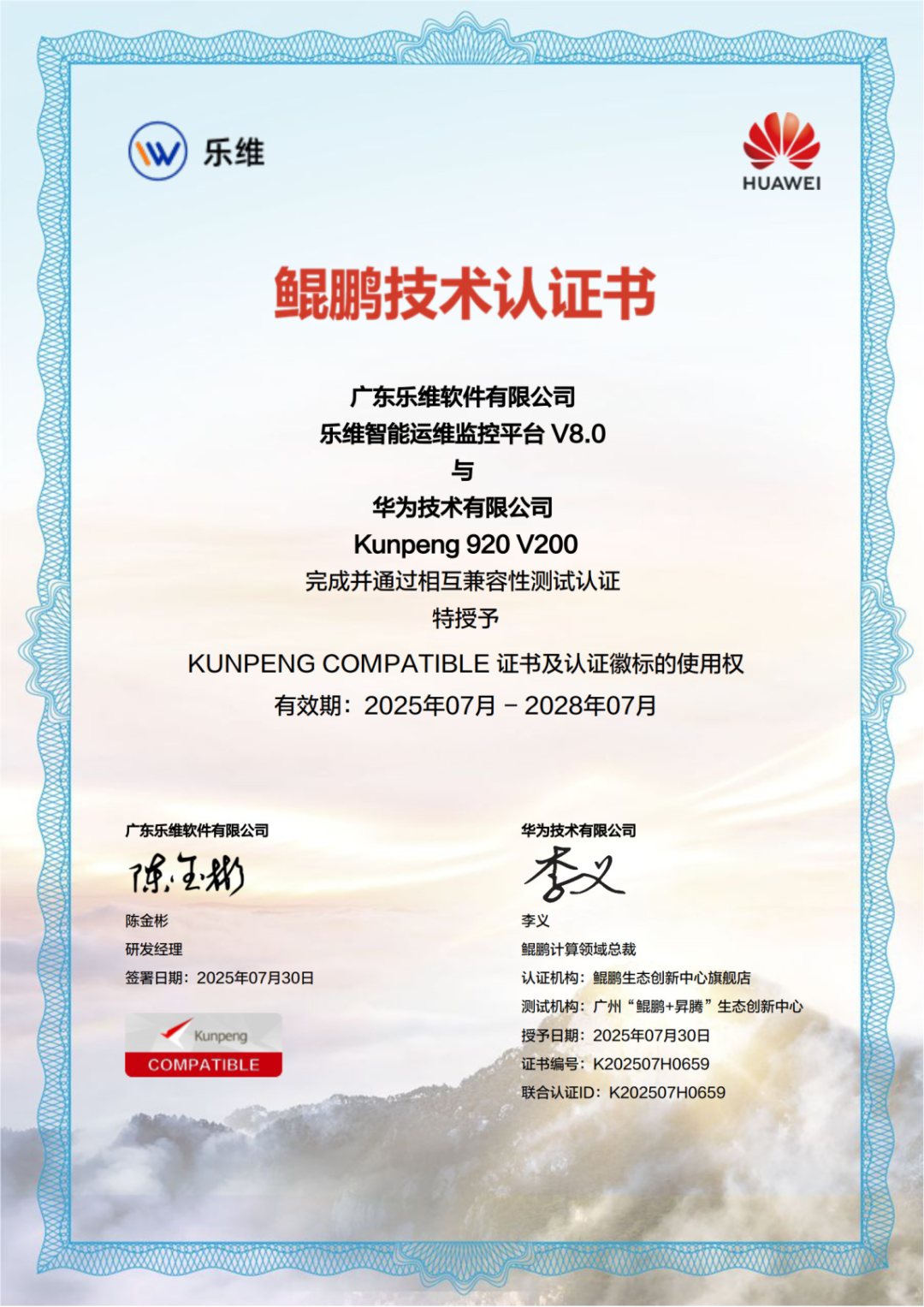 近日,乐维自主研发的智能运维监控平台V8.0与华为Kunpeng 920 V200完成并通过相互兼容性测试认证,成功获得KUNPENG COMPATIBLE 证书及认证徽标的使用权。这一认证标志着双方在技术适配与生态共建领域的深度合作迈出关键一步。