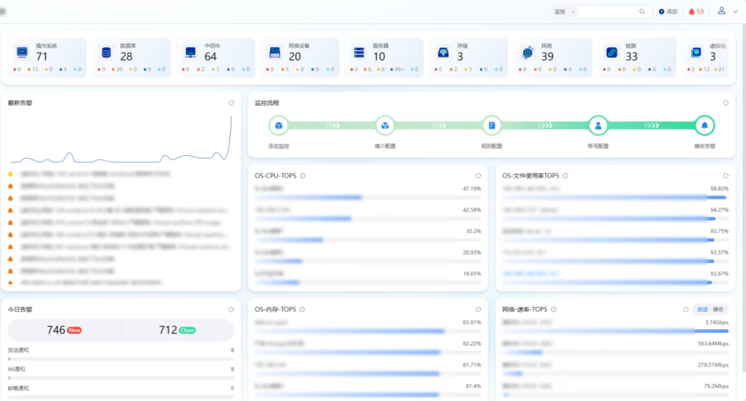 在虚拟化、数据库、中间件、存储及服务器存储等领域,乐维监控同样表现出色。虚拟化监控覆盖FusionComputer、云宏虚拟化等平台,监控集群、管理台、存储、宿主机、虚拟机状态,并实现平台告警对接与资源关联状态监控;数据库监控支持达梦、高斯DB、TDsql、Credis等类型,能追踪SQL排名、redo log、数据库dataguard状态及日志同步情况;中间件监控涵盖Ngix、RabbitMQ、Tomcat,实时掌握控制台数据采集、连接数、健康状态、线程池状态及server状态;存储监控采用专门工具,对宏杉存储、爱数备份软件进行数据查询;服务器存储监控则通过SNMP采集IBMC信息,监控浪潮、联想、华三、百信等品牌设备的健康状态、硬件状态与资源信息。