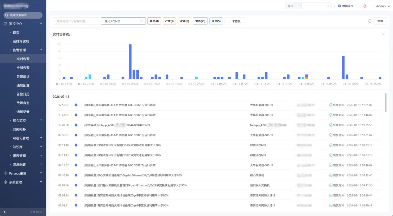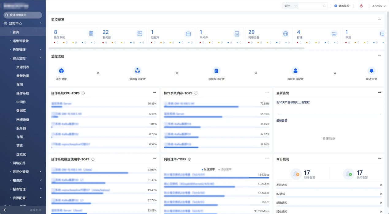 构建集团级统一运维管理平台,采用SNMP、IPMI、Agent等标准化协议,全面接入集团总部华为交换机、天融信防火墙、奇安信IPS等全类型网络设备,以及浪潮5286 M6、联想SR850、华三R5300 G6等品牌的服务器、存储设备,同时覆盖核心操作系统、跨区域链路等所有监控对象。平台实现了统一纳管、统一告警、统一权限、统一界面,让运维操作从原本的“多平台切换”变为“单一入口全局查看”,从根源上解决监控碎片化问题。