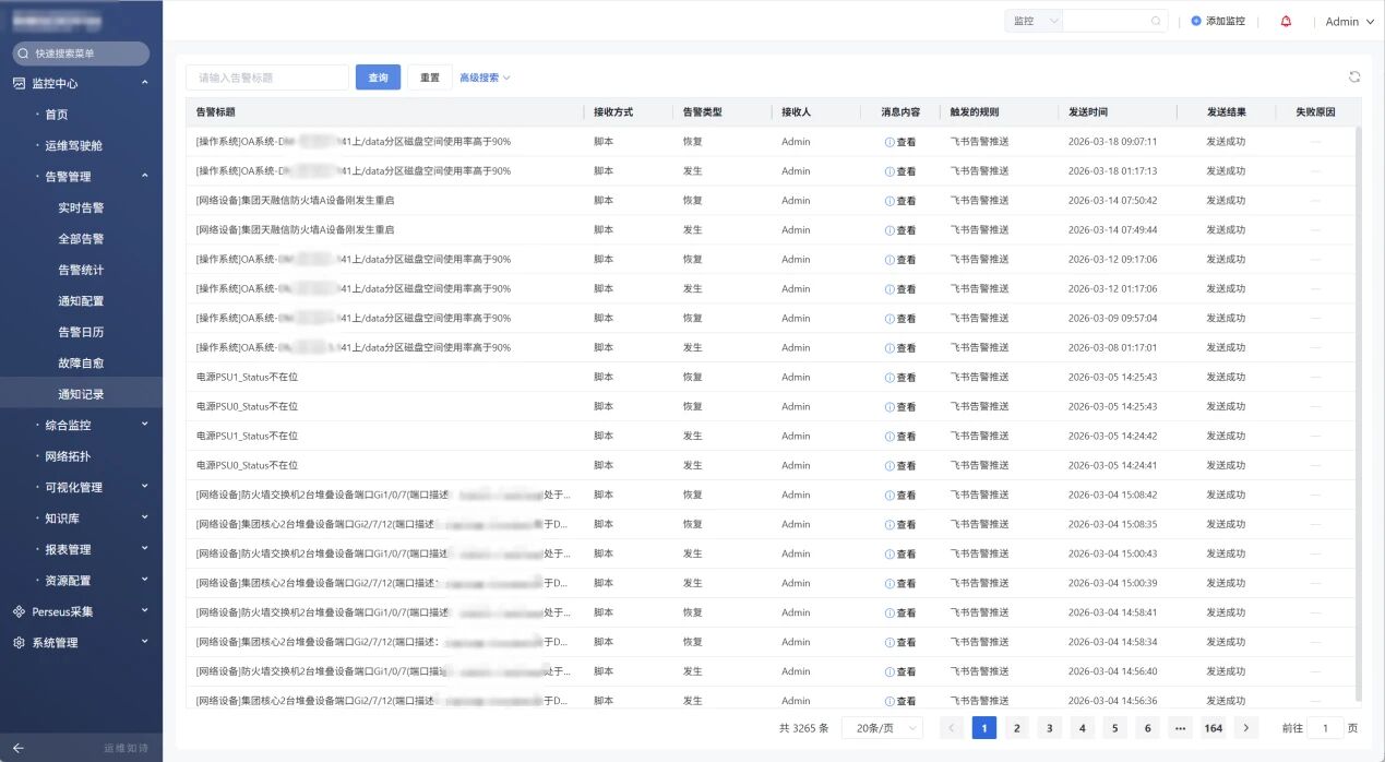 建立重要告警的飞书实时通知机制,当系统触发硬件异常、链路中断、性能阈值超标等关键告警时,告警信息将自动推送至指定飞书群组或运维负责人,确保运维人员第一时间感知问题。同时依托飞书的即时沟通能力,实现告警处理人员的快速联动、协同定位,打造“告警推送—协同处置—闭环跟进”的故障响应流程,大幅缩短故障发现与处理的时间差。