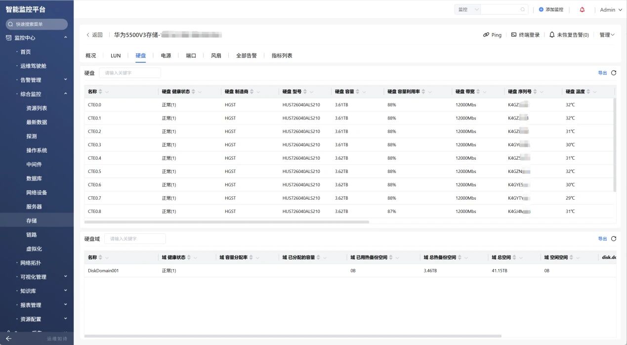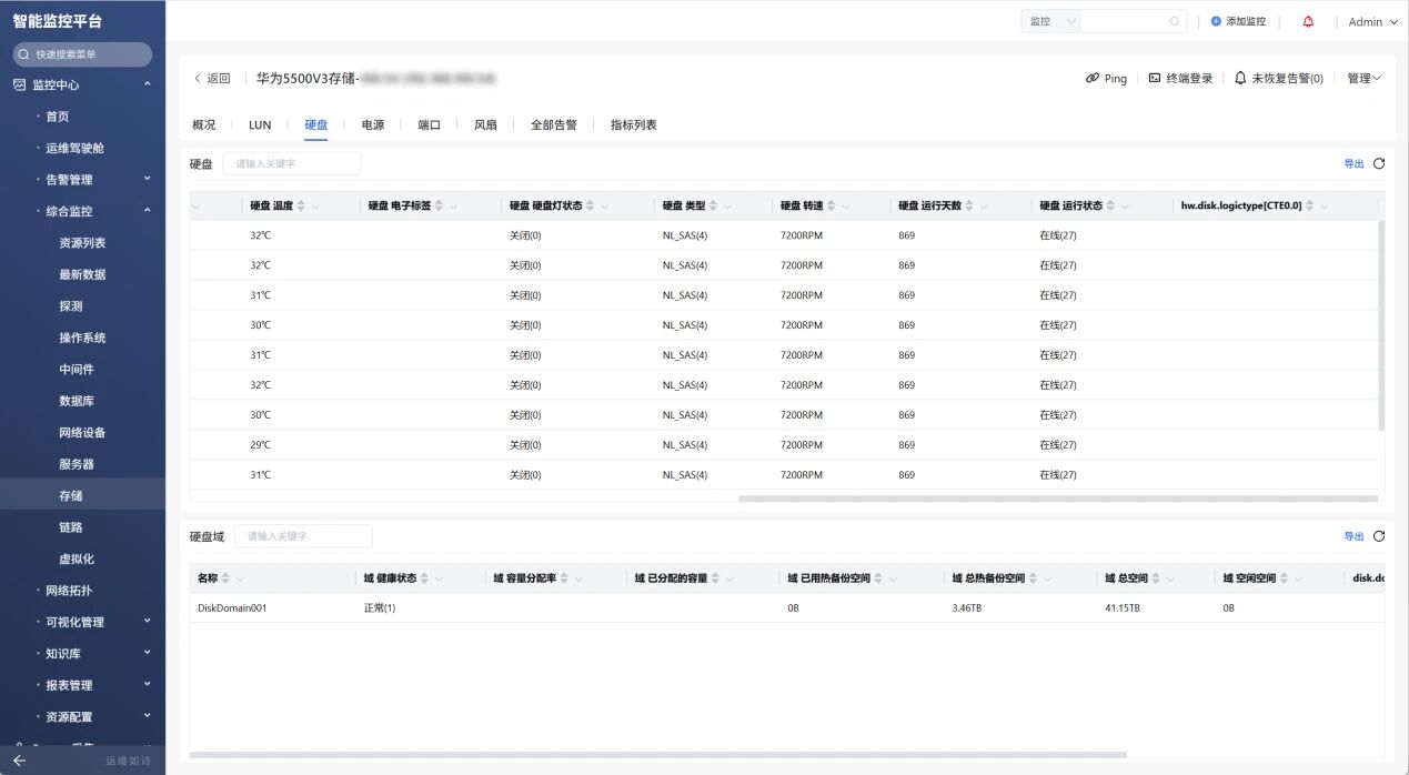 采用SNMP、Redfish、IPMI等标准化硬件管理协议,对服务器与存储设备开展全维度、精细化监控,重点采集硬盘状态、电源模块、风扇转速、设备温度、RAID阵列状态、主板及部件状态等核心硬件健康指标与性能数据,实现硬件监控的全覆盖、无盲区。通过阈值预警设置,让硬件异常被实时感知、精准定位,从“故障发生后被动排查”转变为“主动巡检、提前预警”,为集团业务系统稳定运行提供底层硬件保障。